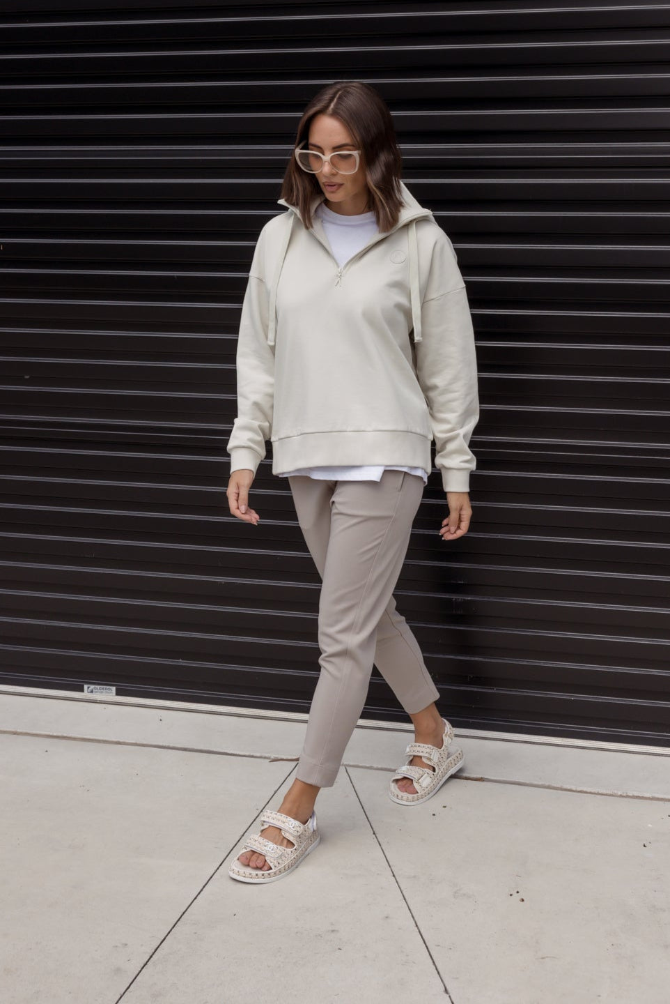 The LARGO hoodie is the ultimate layering essential, designed to pair seamlessly with the GRETA Trench for a refined street style look. Crafted from premium weight cotton, it offers a balance of structure and comfort, while the high-neck collar and quarter zip add a modern touch. Finished with a rubber logo seal and ribbed detailing, this drop-shoulder silhouette brings effortless versatility to your wardrobe.