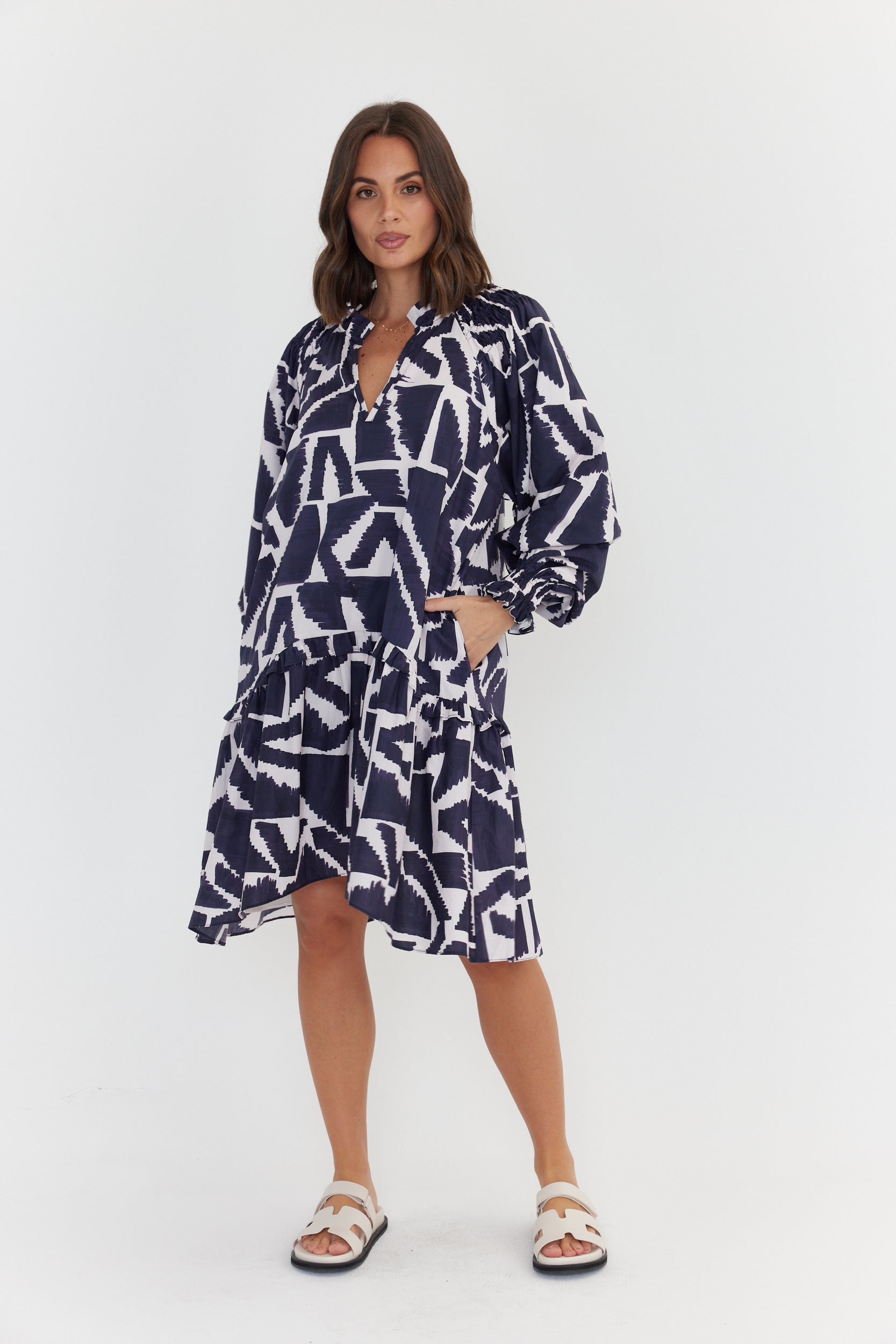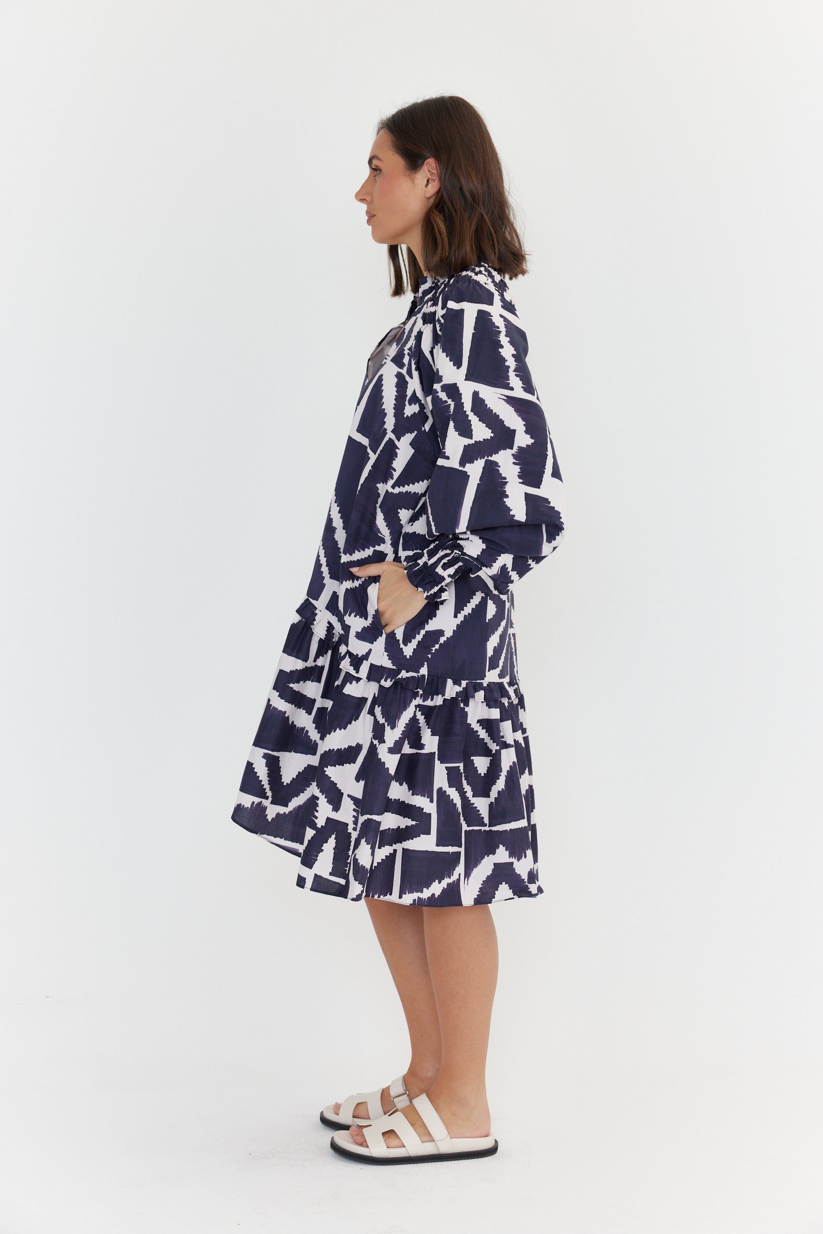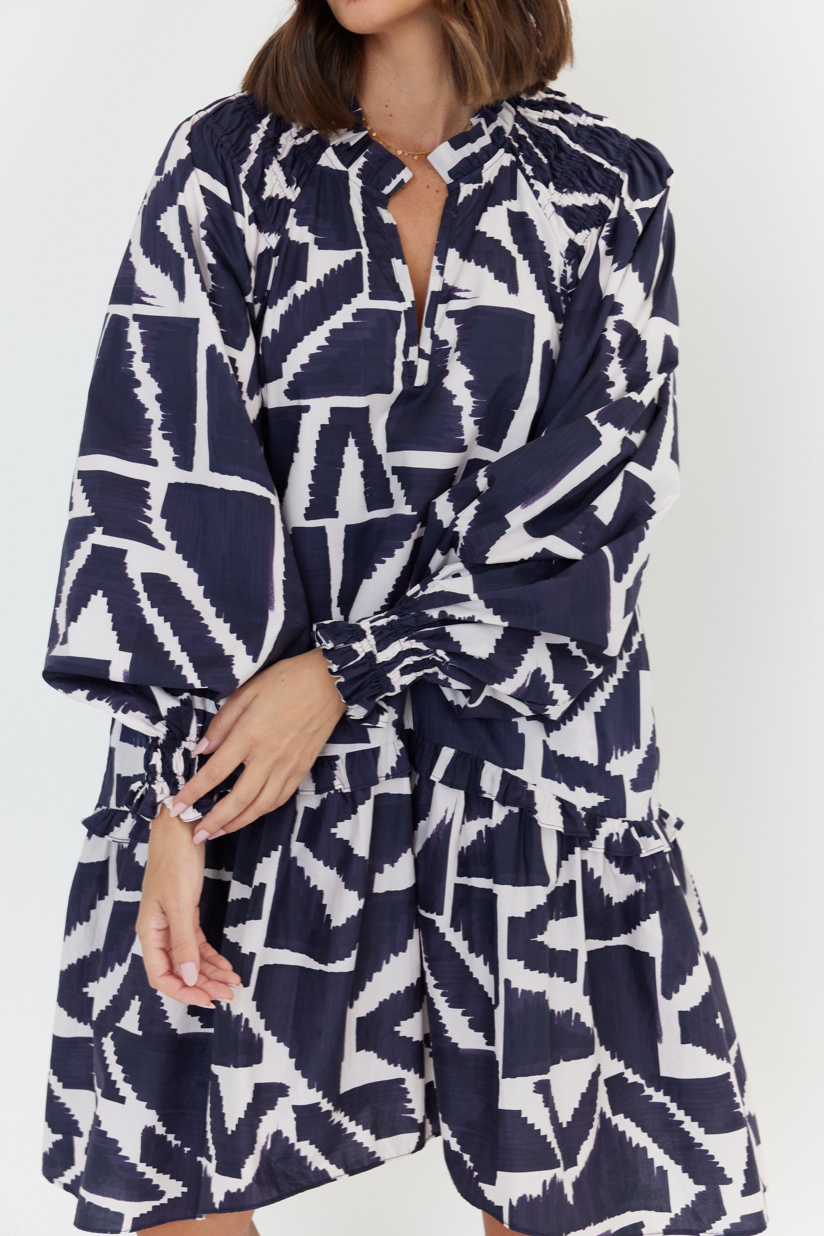• Long balloon sleeves with elastic shirring detail and frill at hems
