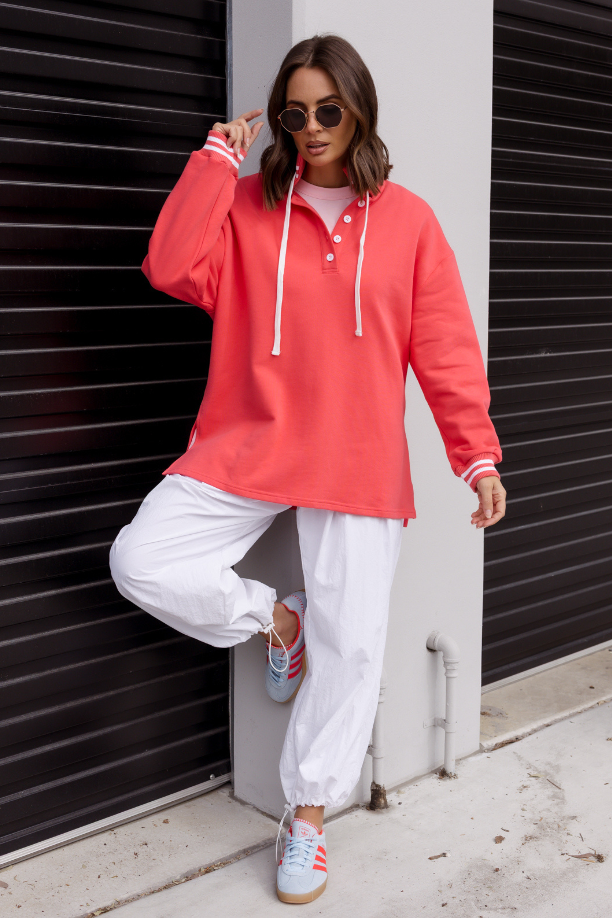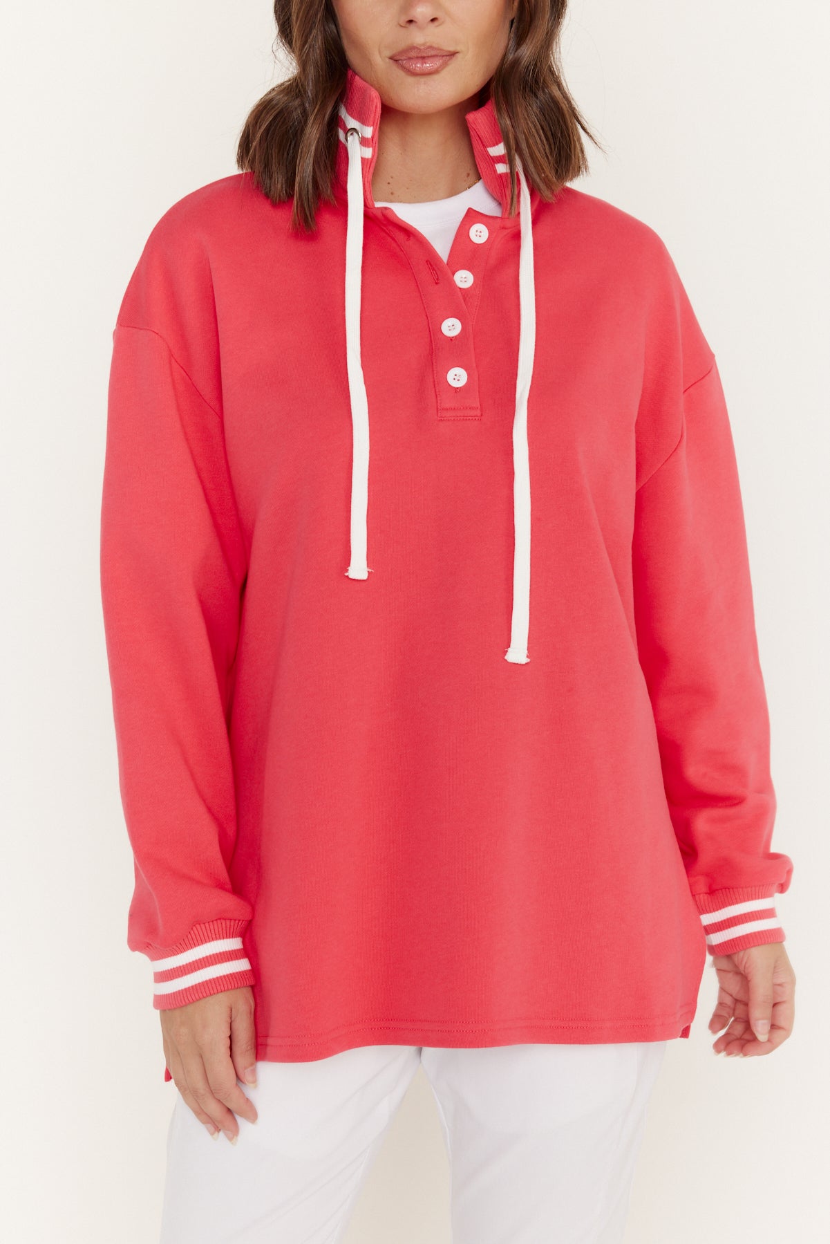 The TOYA Jumper is where classic design meets modern edge. Crafted from soft, medium-weight cotton, it offers warmth and comfort with a refined touch. The ribbed neckline, striped collar, and cuffs add subtle contrast, while the quarter-button front and drawstring collar bring a sporty versatility. Finished with side splits for effortless movement, perfect for elevating your everyday wardrobe.