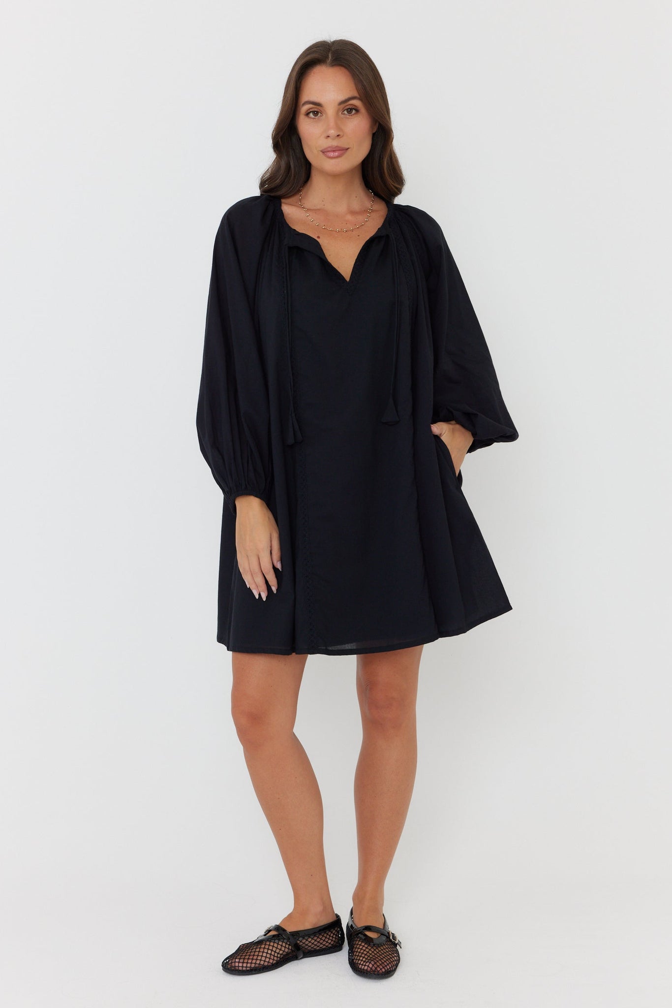 - Gathered neckline into a crew neck with centre-front split and ties