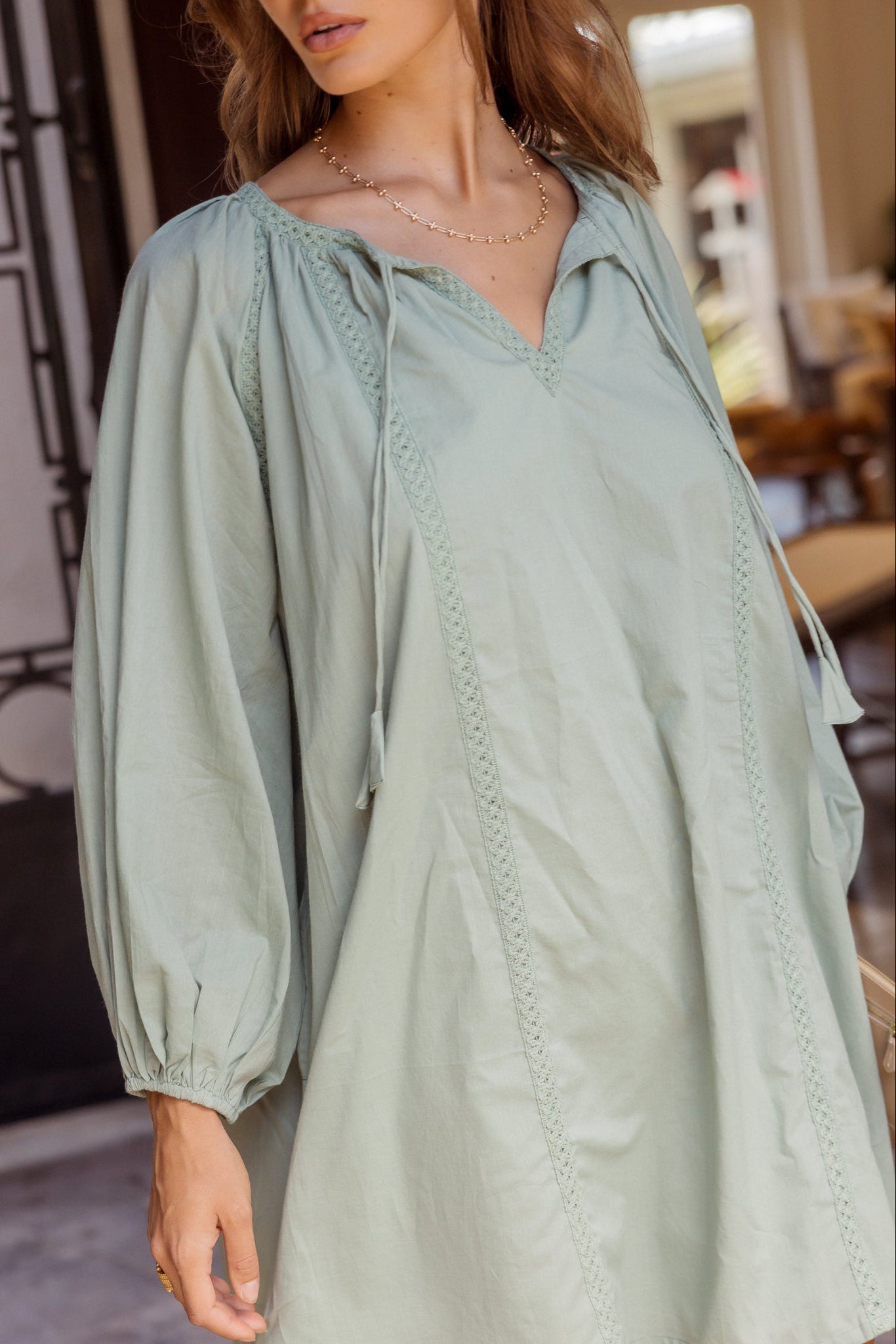 - Gathered neckline into a crew neck with centre-front split and ties